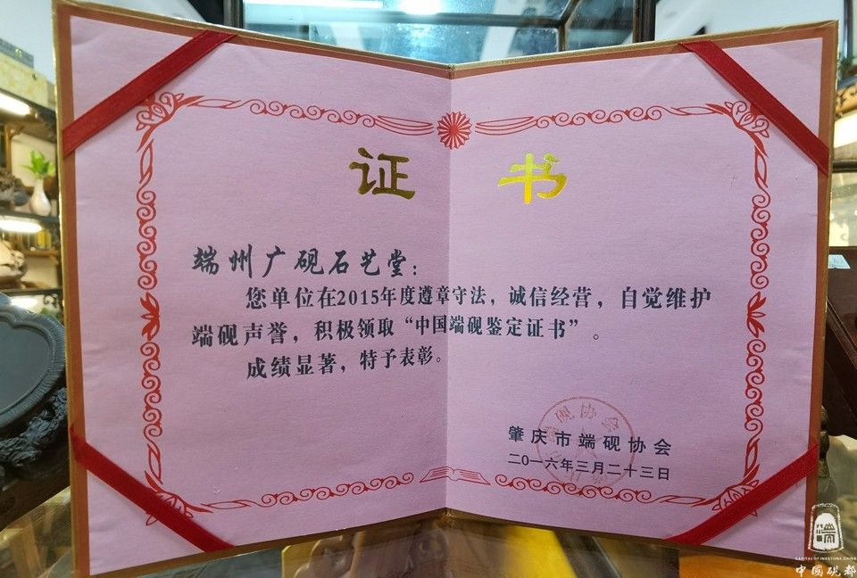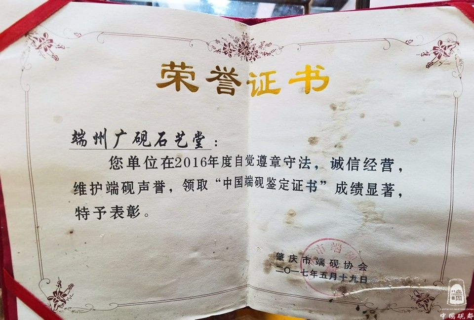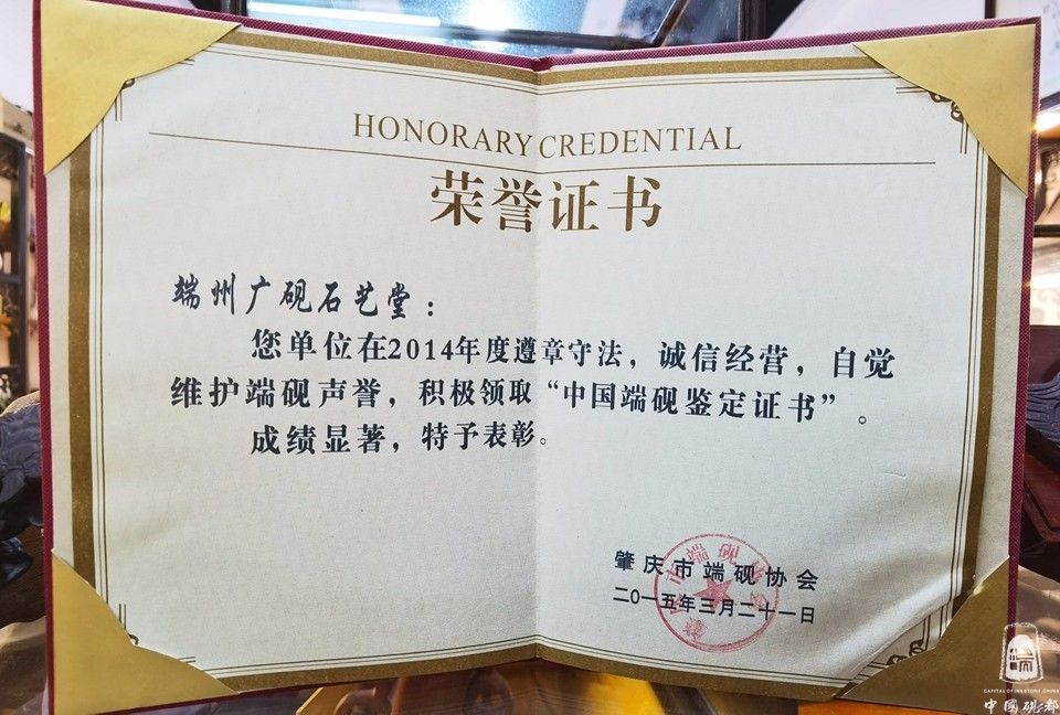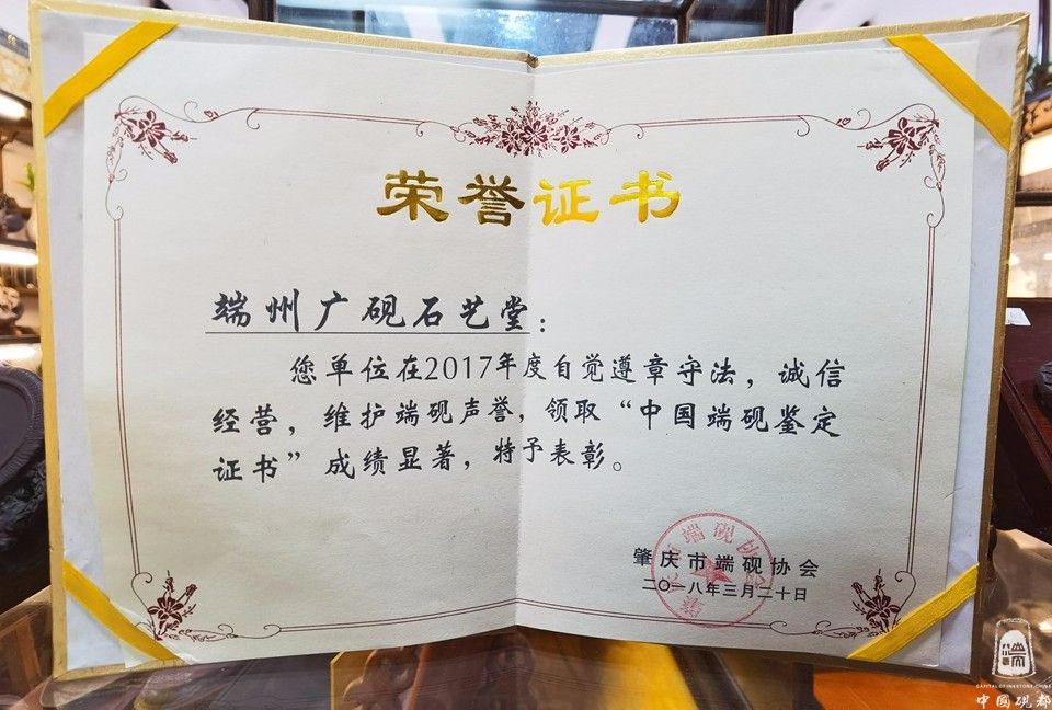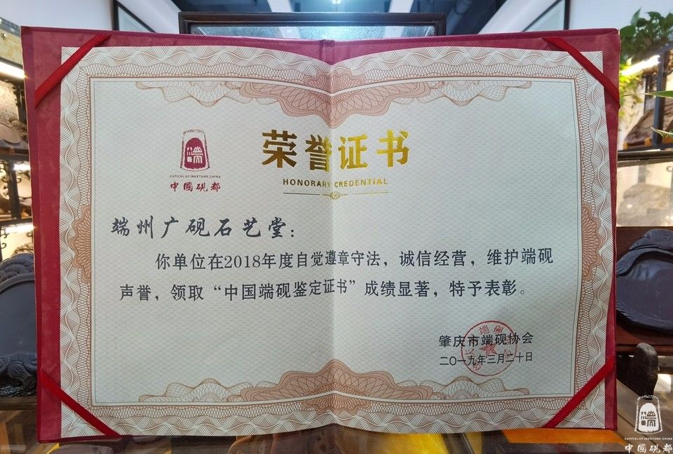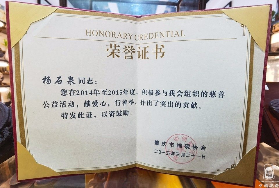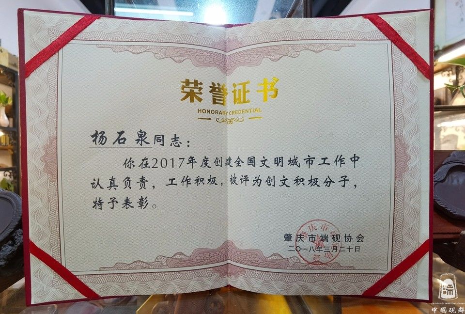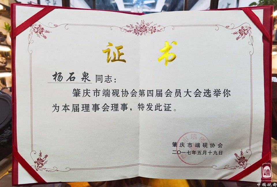 杨石泉,男,1979年9月出生,现为肇庆市端砚协会理事、工艺设计师,杨石泉同志出生于金渡砚坑村3队(砚坑村是3大名坑:老坑、坑仔、麻子坑的出产地)从小就和端砚石结下了石缘,从小对着石头长大的我对原料有深厚的了解和研究,2010年开始从事做端砚石料供应商,到2014年註册成立(广砚石艺堂)经营部,集“石料、生产、成品、销售”的一站式服务,热心于端砚文化,积极参与协会组织的慈善公益活动,2017年被评为创文积极分子,对推广端砚业发展不遗余力,从2014至2018年连续5年获得端砚协会颁发的诚信经营,维护端砚声誉,领取“中国端砚鉴定证书”成绩显著奖彰。