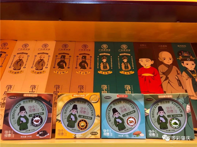 以肇庆名人卡通为包装的酥饼、裹蒸粽、曲奇饼干等旅游手信,在产品中融入名人故事,具有设计感的外观,吸引了年轻人的目光。