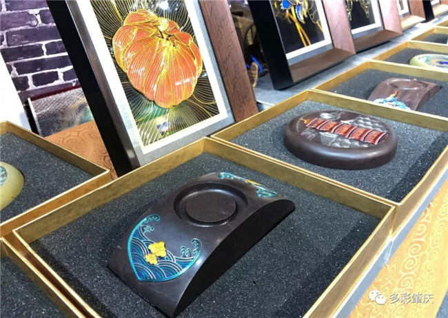 6块巴掌大小的不同砚坑石制作的端砚套装,既美观,又可以直观让大家了解到肇庆不同砚石的特点。