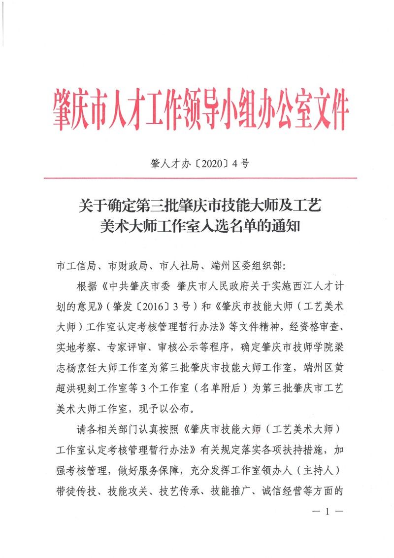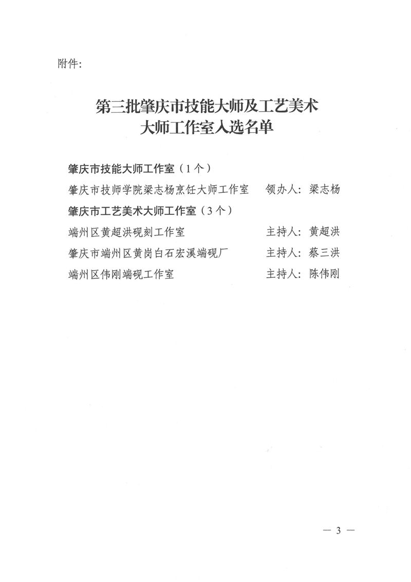 关于确定第三批肇庆市技能大师及工艺美术大师工作室入选名单的通知