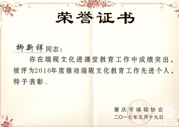 2017被评为推动端砚文化教育先进工作者证书