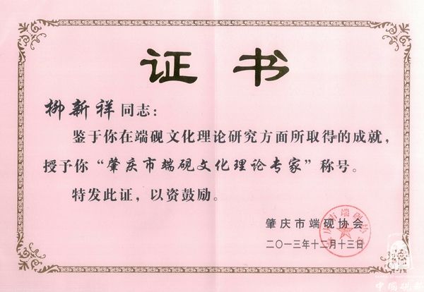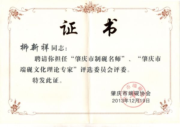 2013年担任肇庆市制砚名师、端砚文化理论专家