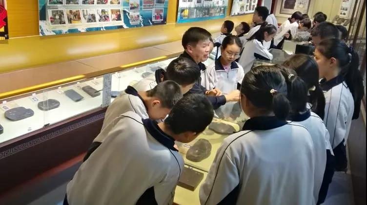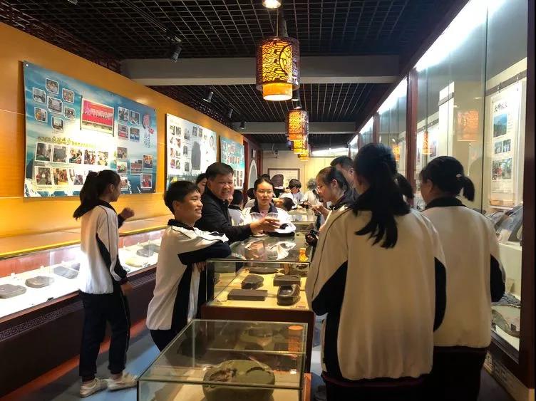 中国工艺美术大师张庆明先生在四中端砚展馆带领学生一同参观端砚展馆,并作现场讲解,让学生对端砚的由来有了更深入的认识。