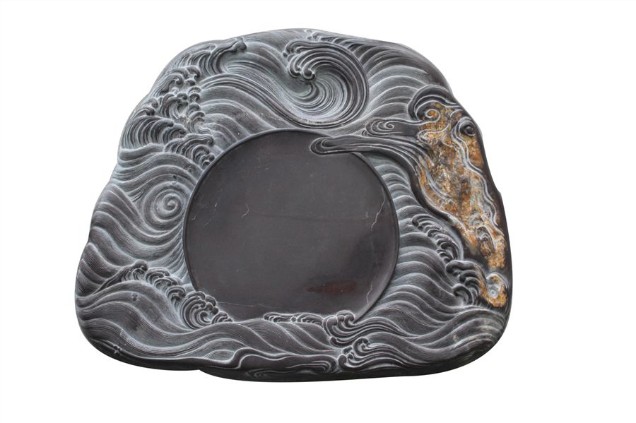 “如月之恒,如日之升。如南山之寿,不骞不崩。如松柏之茂,无不尔或承。”此砚选端溪坑仔岩制之,取其之意境雕刻。像月亮一样永恒存在,像太阳一样日日升起。此砚雕工细腻,一丝不苟,巧妙利用石皮,彩云飘逸,波涛澎湃。砚堂大片蕉叶白和火捺相互映衬,格外艳丽。此砚在2014年第十六届中国(国家级)工艺美术大师精品博览会中获“中国工艺美术---金奖”。