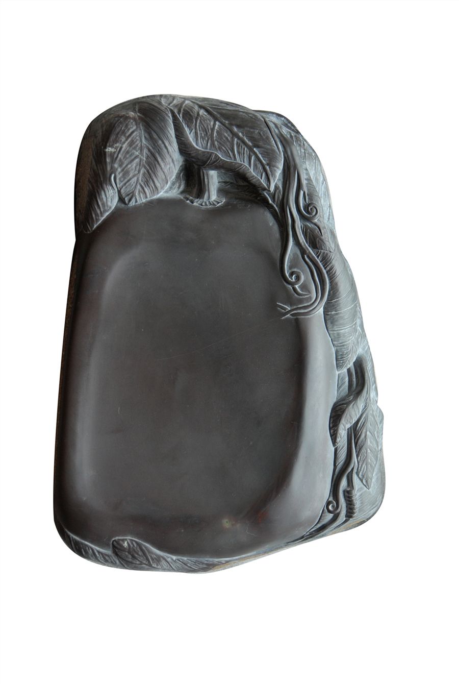 此砚根据石型,雕成瓜蝶状,中为砚堂,砚背雕大叶小瓜,并寓意“子子孙孙永绵绵”。