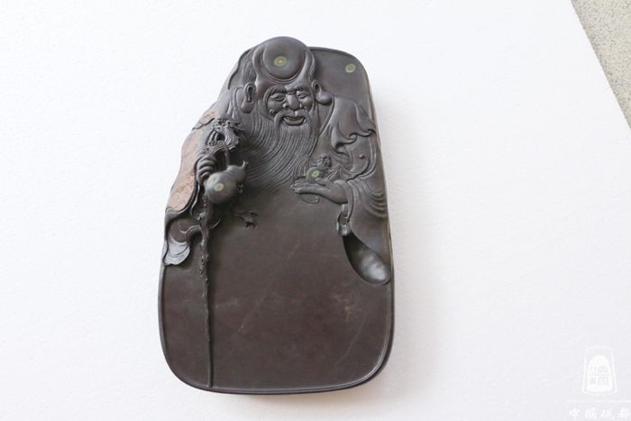 点评:寿星,人们又称之为南极仙翁,寓意多寿多福。该砚利用砚材本身形状和石品,雕塑一个寿星公,石眼点缀寿星和身上宝物,增添不少灵气,雕刻线条十分柔美流畅,砚堂宽敞,美观又实用,是一件寓意深刻、精妙绝伦的佳作。