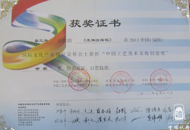 该砚在2012中国(深圳)国际文化产业博览交易会上获得“中国工艺美术文化创意奖”金奖。