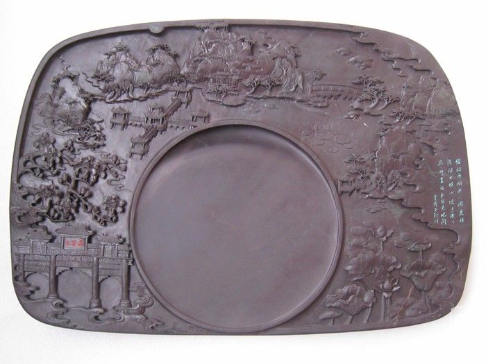 点评:春到星湖,树树皆锋火,满堤尽是木棉花。夏至星湖,荷花盛放,绿满湖山夏更幽。砚作者以刀笔将山明水秀,草木葱茏的星湖美景浓缩于砚上,悄悄告诉赏砚者,风光旖旎的星湖,一年四季,随处都是你心灵的牧场……