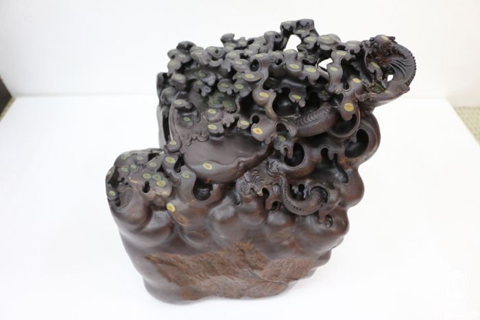 点评:此砚中藏着众多大大小小的石眼,作者采用深雕手法使之一一呈现出来,整方砚石外形恰似山顶上一片群星璀璨的祥云,一条腾空而起的祥龙盘桓而上,形象威猛矫健,象征步步高升之意,也表现了对美好前程的无限憧憬。作品布局精巧,雕刻细致,刀工精湛,颇具匠心。