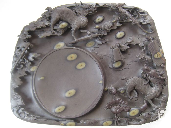 点评:传说,麒麟为仁兽,是吉祥的象征,能为人带来子嗣。相传孔子将生之夕,有麒麟吐玉书于其家,上写“水精之子孙,衰周而素王”,意谓他有帝王之德而未居其位。麒麟脚踏暗八仙,麒麟吐玉书皆寓意吉祥,有招财、趋吉之意。此砚是蔡家传统民俗吉祥题材砚雕精品,赋予中国传统民俗文化内涵,颇具艺术价值与韵味。