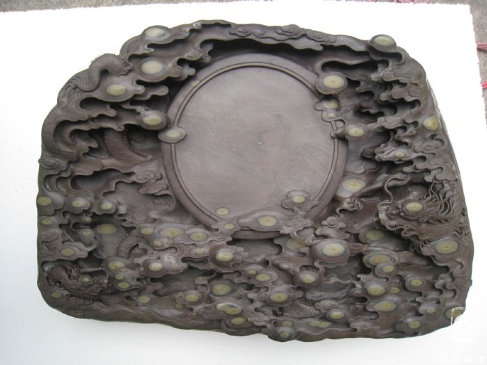 点评:在广漠的夜空中,漫天的繁星犹如一颗颗绚丽夺目的宝石层层环绕着如白玉般皎洁的明月,双龙翱翔于云层之间,似追星逐月,似相互嬉戏······作者以精湛的镂雕、透雕技艺把双龙翱翔的矫健之姿与满天星斗的美丽夜景惟妙惟肖地表现出来,砚面整体布局合理,雕刻精致,线条流畅,意境尽显。