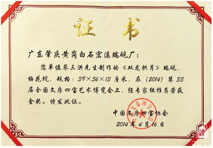 该砚在(2014)第33届全国文房四宝艺术博览会上,经专家组推荐荣获金奖。