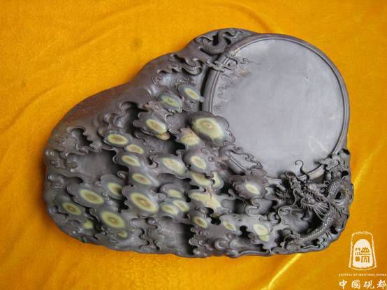 点评:此砚龙首的神态威风,气势不凡,石眼为星,祥云萦绕,风起云涌,巨龙在云中来回穿梭,“动”在其中。云雾萦绕都十分注意以线条表现赋予其生命力,使之有动感、运用浮雕手法因材施艺,寓意太平盛世。且砚中有一个大砚堂,赏用并彰值得收藏。