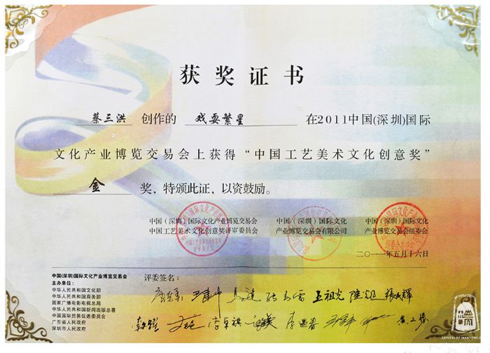 该砚在2001年中国(深圳)国际文化产业博览交易会上获得“中国工艺美术文化创意奖”金奖