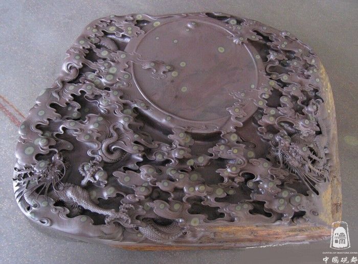 点评:璀璨的群星闪烁,皓月在祥云中穿行,神龙在广袤的天际遨游……砚作者是端砚世家蔡氏家族传人,祖上以擅长雕刻“云龙”而著称,被砚界及收藏界尊为“蔡家龙”。此砚承继“蔡家龙”的精魄神韵,以精湛的镂雕、透雕、浮雕技艺凸显九五之尊的神龙九天之上驭繁星的强悍与劲健,在保持传统砚雕隽永古意与捕捉现代审美情趣中寻找平衡,尽脱繁缛匠俗之气,堪称“蔡家龙”之精品。