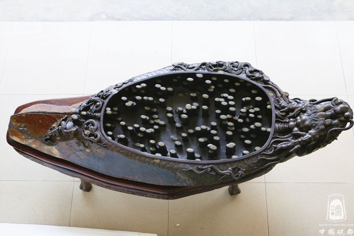 点 评:龙是我们的图腾,也是我们整个国家和民族的精神图腾。此砚造型气势恢弘,一条体态矫健、磅礴威严的腾龙盘旋于中华大地,信步于天地海之间,宛如正在铸造一幅辉煌的华夏文明图。雕刻者巧妙地利用梅花坑石眼满布的特点,寓意中华天下是有56个民族的大家庭,所有的民族都同根同源,彼此之间血脉相连。砚雕者精湛的雕刻技艺惟妙惟肖地展示了作品中腾龙威严的神态,其创意和雕工堪称一流。