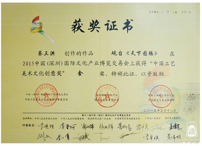 该砚在2015年中国(深圳)国际文化产业博览交易会上获得“中国工艺美术文化创意奖”金奖