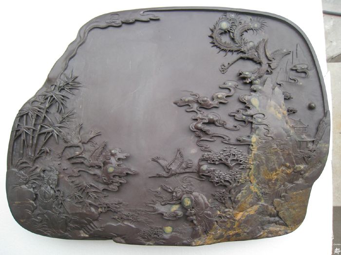 点评:竹引凤凰松引鹤的传统砚作,寓意富贵、平安、和谐、仙寿绵长,砚作者以传统技法雕仙人手持箫管,端坐于修竹之下,吹奏仙乐,余音美妙,凤凰与仙鹤应声飞来……以黄色石皮俏色巧雕的俊秀山峰与天外飞凤,气势非凡,飘逸生动。细赏此砚,如闻天籁之音,如柳如丝,委婉入耳,其声宛如凤鸣,回荡于空,引来天外飞凤。作品构思精巧,布局有致,线条秀美,工艺精湛,鲜明的主题充满着对美好姻缘的祝福与幸福生活的期盼。