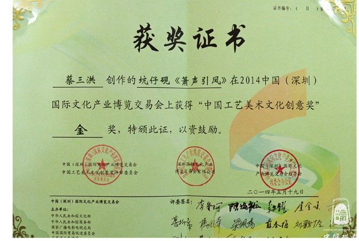 该砚在2014中国(深圳)国际文化产业博览交易会上获得“中国工艺美术文化创意奖”金奖。