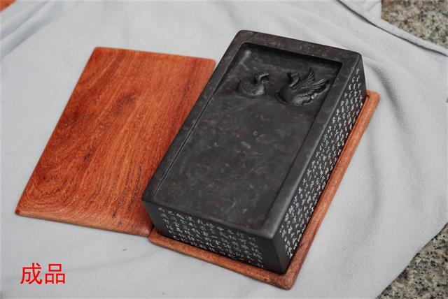 配制砚盒是端砚生产中的辅助工序。砚盒是用名贵的红木料来制作,主要作用是防尘并起到保护砚的作用。因随“砚形”而合理配盒,在外观上会使端砚更加凸现古朴、凝重的效果。砚盒配成后要打磨上漆(可不上漆),传统的磨盒方法是先用砂纸将整个砚盒磨平磨滑(干磨),然后进行上色粉,最后上清漆。砚盒要求色、漆厚薄均匀,必须将原本的木纹清晰的表现出来。同时,做工精致或用名贵木材制作的砚盒以及不同形制的砚盒本身又是一件很好的艺术品。
