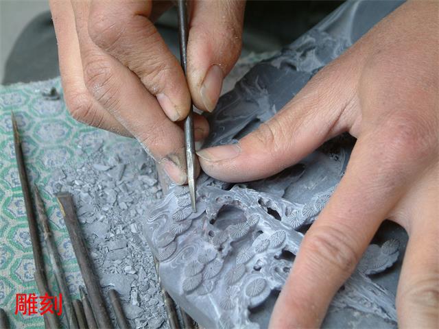 雕砚用的刻刀很多,大致上分平口刻刀和圆口刻刀两种,此外还有木槌和铁槌等辅助工具。刻砚的步骤是首先进行粗刻和雕刻墨堂,然后才进行细刻精雕。粗刻是将图饰刻成一个大体的轮廓,细刻就是将图饰的轮廓进行精刻并最后成型。
