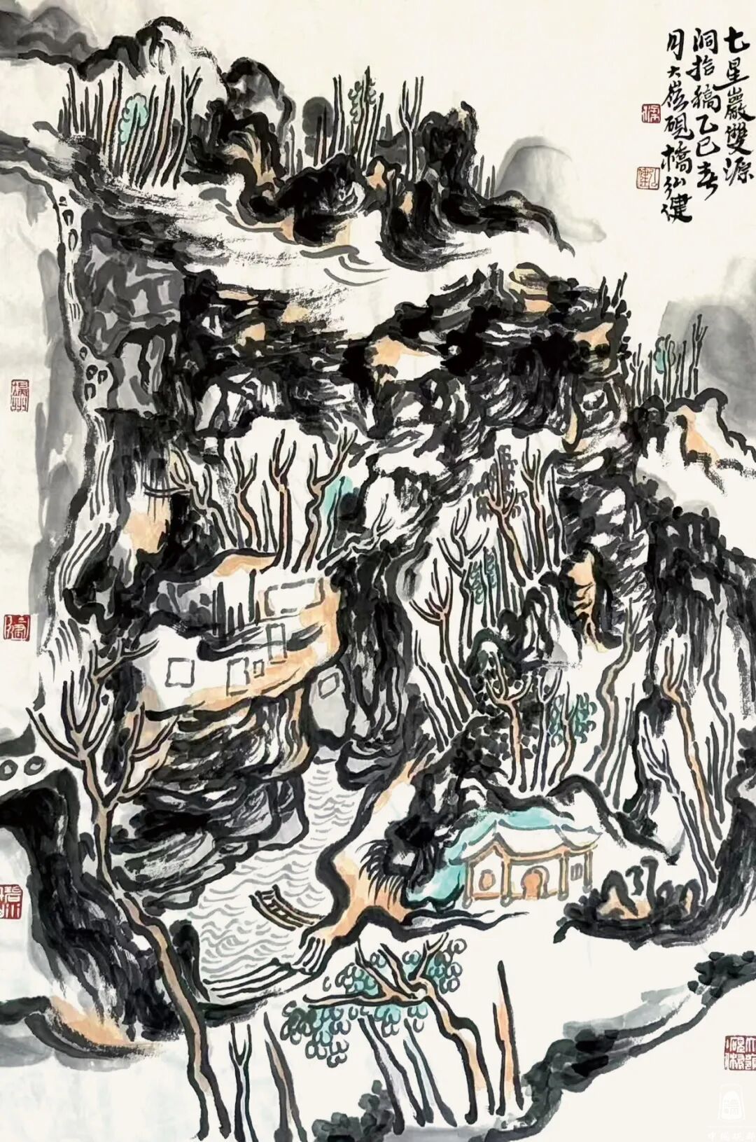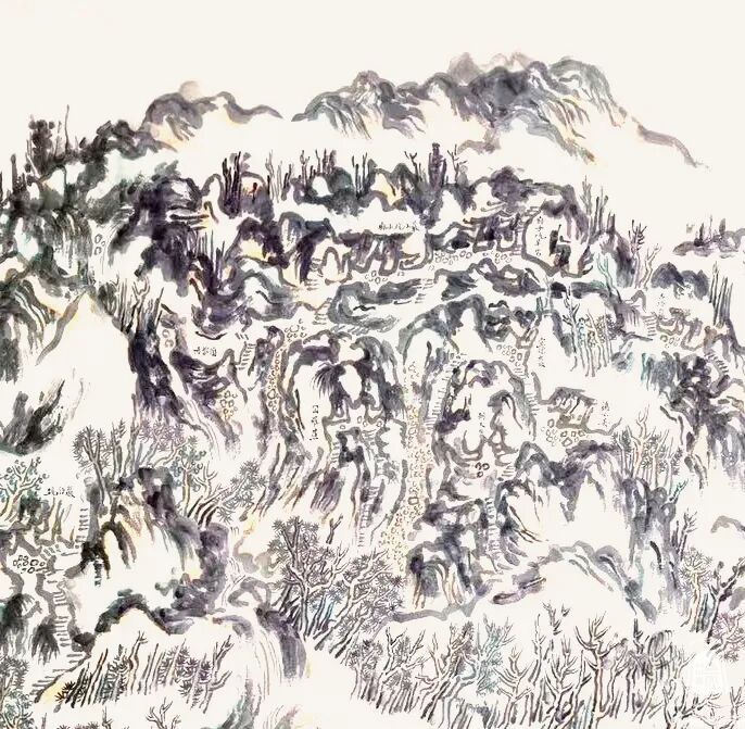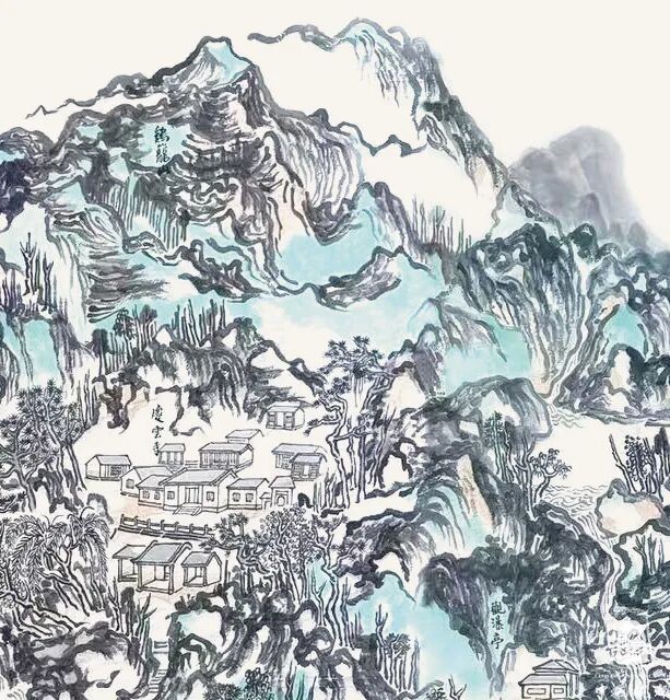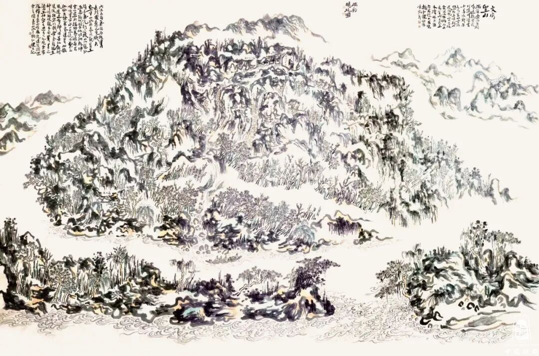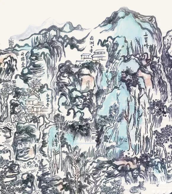 另一幅大作品《鼎湖飞泉万古流》,从整体上读来,满纸笔墨。此幅要算得上是肇庆地区鼎湖山的纪事性绘画作品,这画中的景点标注十分详尽,如游历其中,神仙视野。不由得让我想起沈周当年的《庐山高图》,以崇高之势,取势以天地大相,冠以“三远法”的精彩之作。这种画法也是传统中国画的一种表现方式。梁弘健喜欢在山与水之间呈现家乡,他对家乡肇庆(古称端州)的情很深,几十年如一日的体会到这方水土给予个人的滋养。虽然这幅画,还有可以精进的地方,却能于笔墨、于气势、于形质,也堪称大手笔。我想,有一种经验叫做沉浸式观看,声形并茂,能融为一体,甚好。这里能感受到瀑布溪泉之声,感受到山石结构时的疏密,也更能体会山川美感与人文精神价值的重要所在。