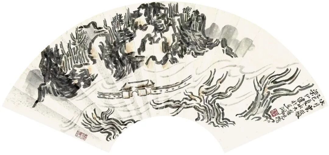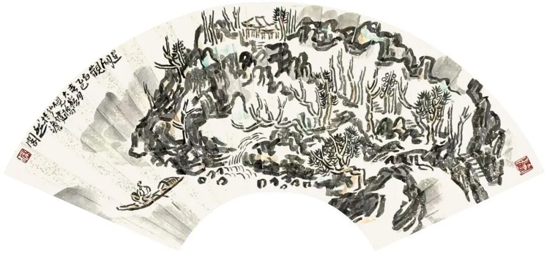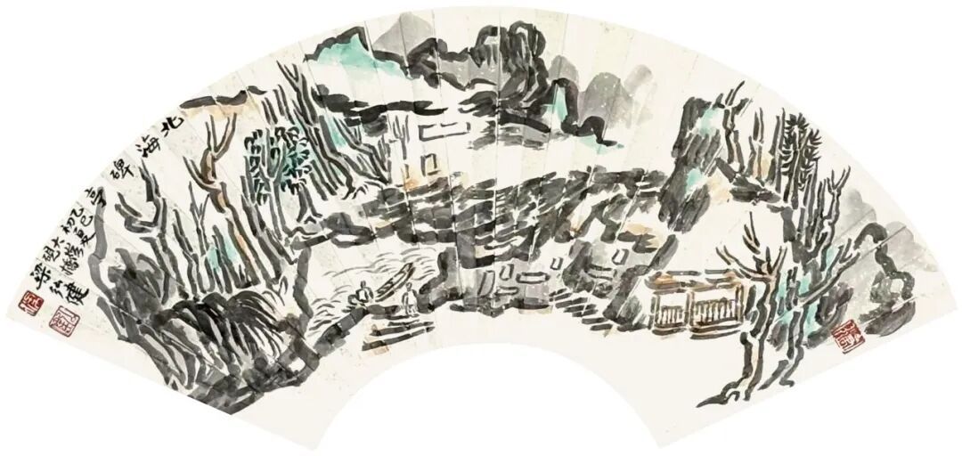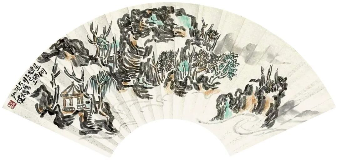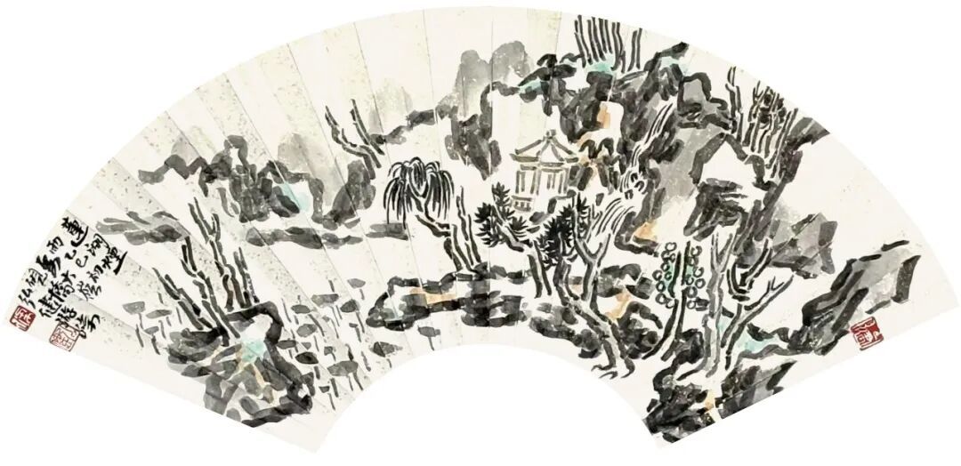 观梁弘健山水小品中的扇面作品,也似乎可以观察其山水画创作的未来可能性。这里的笔与墨已是特别有意味,有知觉,比如《星湖观白》《双源洞天》《北海碑亭》《星湖烟雨》《水月云岩》《莲湖烟雨》等。其中《双源洞天》,此幅的笔墨松脱,多以用笔架构画面,疏朗清雅,极有感染力,山泉映照,云光远影,树木叠翠,沉雄气质在纸上,在于笔好墨好的世界里。