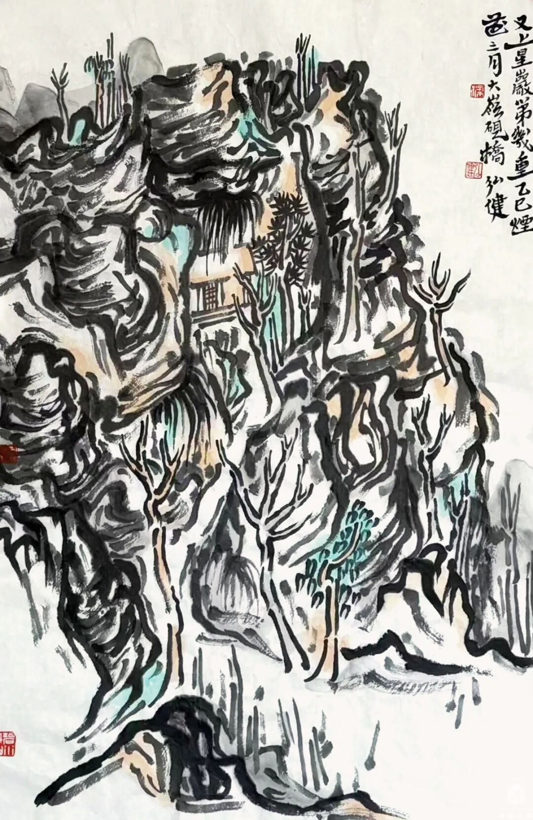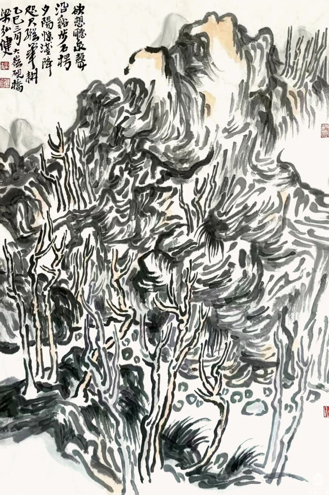 相比花卉而言,他笔下的山水画作品更觉气势明显,更加丰厚,既有视觉感,且画面气势不凡。近些年来,梁弘健在大幅作品中着力,多以广东岭南当地的山水为蓝本,画出像《文房圣山》这种题材,这幅横式作品,恰如:“山势沉雄处,灵光满指尖”,浑厚华滋之品位,在用笔用墨,以笔线造型,造山造水,造得西江之美。在笔墨的营构里,显示云水相拥,山林叠翠,一派气势如虹的气质。见其跋文所记:“端溪叠淌斧柯晴,遮掩云霞列嶂升。读书千年依鄴架,文房圣山吾侪登。羚羊峡柯山藏端砚三大名坑,余冠以雅称为文房圣山,乙巳立冬绘此兼题句寓怀,大岭砚桥,弘健卧游峡脱斧。”我亦感同身受,此画既以侠义大志言表,又将流淌的情怀至爱注入在他的笔墨之中,以情写山川富饶,以心写自我对自然关照,一气呵成。观其山水画的笔墨流动,是活泼泼的状态,时疏时密间,突显出岭南山色青、翠、茂、密之气质,溪泉穿梭于林茂中,以气韵带动画质神采。他着笔墨于简括图象,起伏跌宕,峰峦逸气充满,形色急缓相融中凸显美妙。