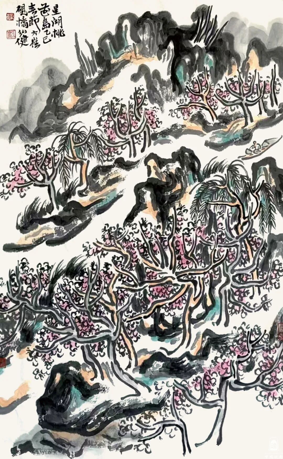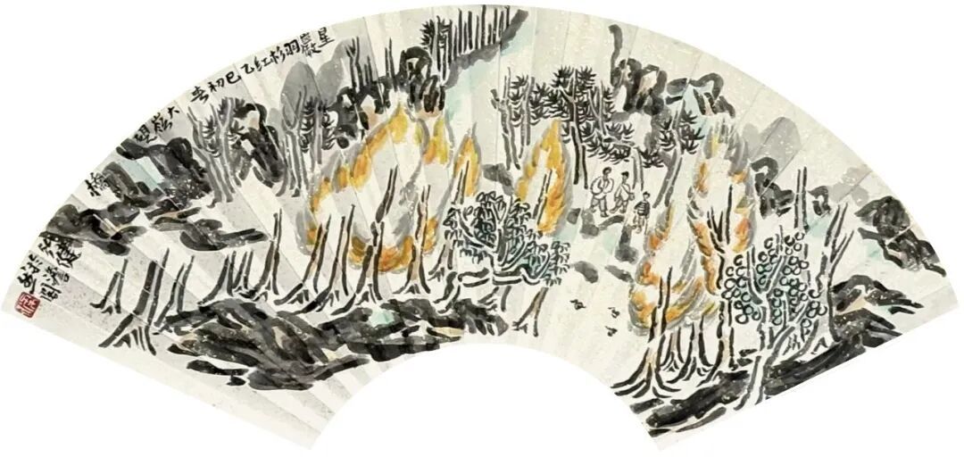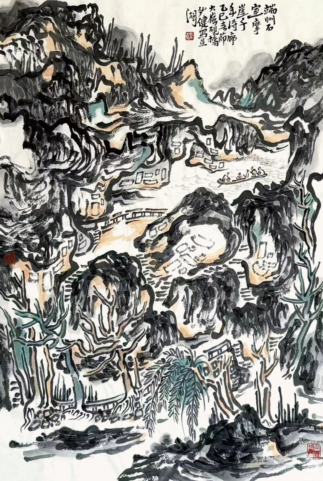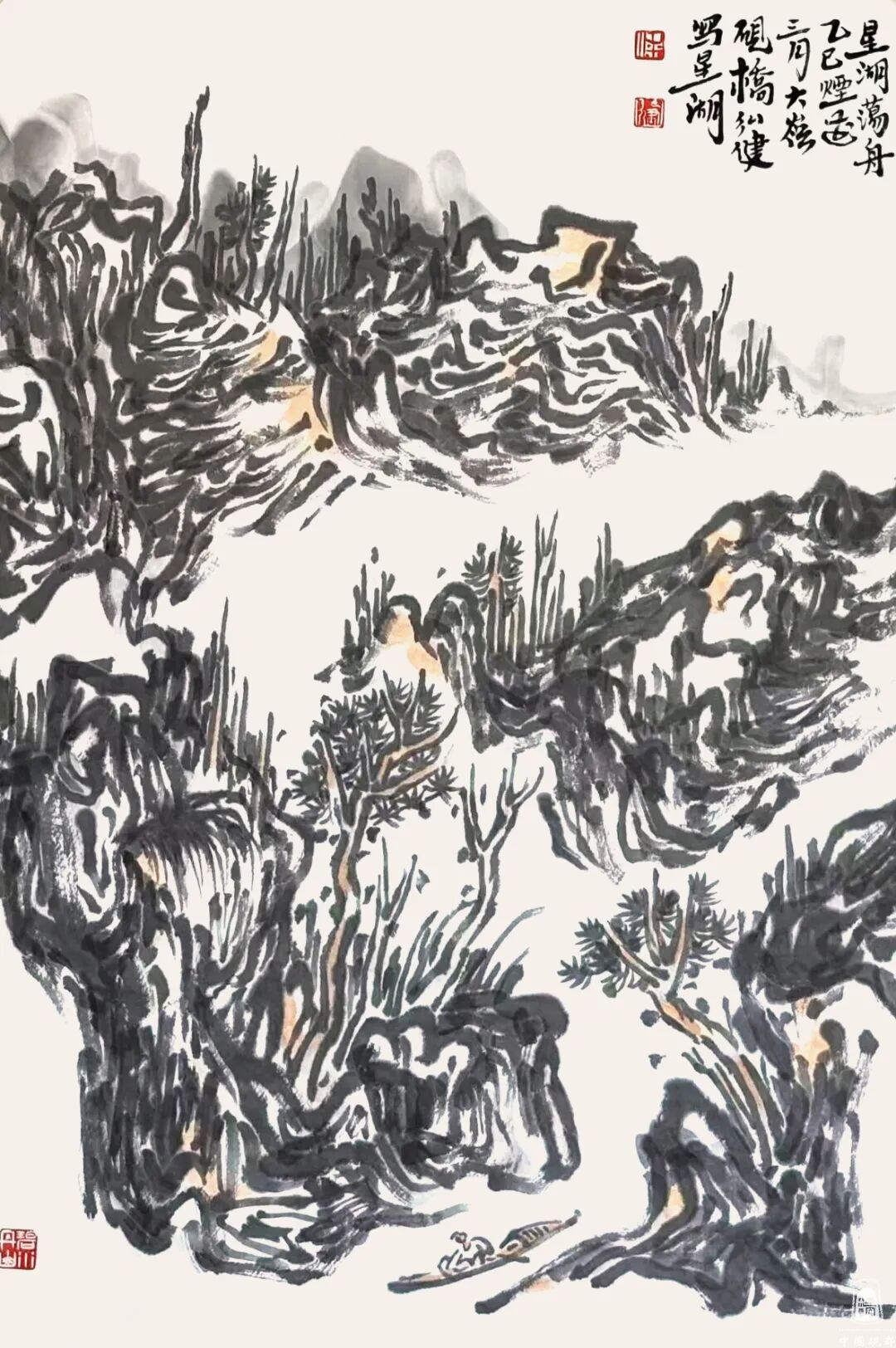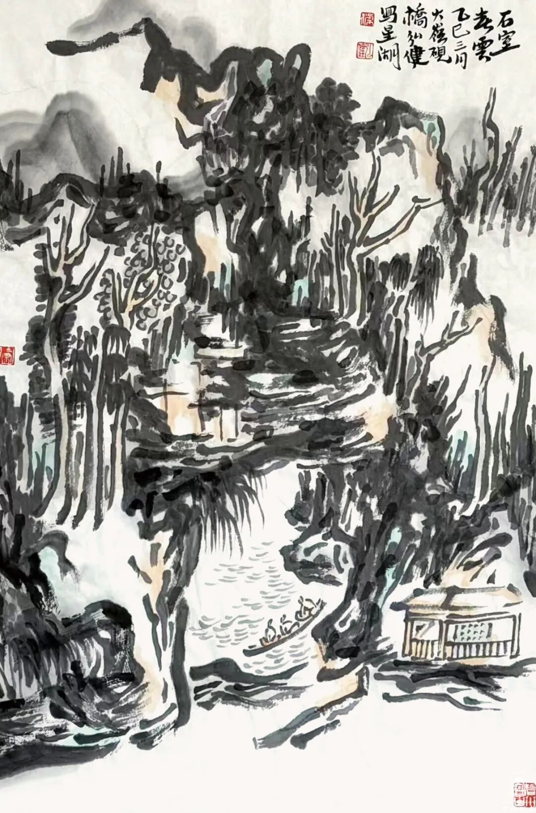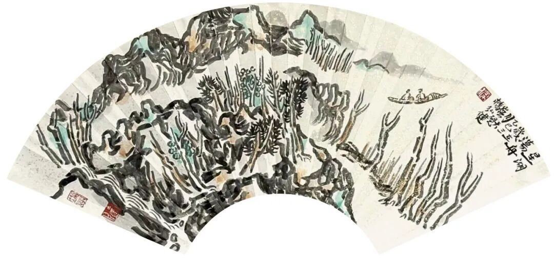 更多的要属当地写生的作品《春入星湖到处花》《七星岩过山亭》《阿坡烟雨》《王屏岩十友亭》《星湖荡舟》《星湖红羽杉》《七星岩双源洞》《星湖烟雨》《星湖桃花岛》《崧台揽月》等。通过这些作品,可以明确理解岭南山水的特色,但他笔下画作与过往的岭南画派的手法又有所区别,他更多地吸收了中国传统文人画造境的手段,以及兼融了近现代黄宾虹、刘海粟、陆俨少几位先生的艺术手法,偏离了岭南画派曾经所倡导的物象写生之理念,在他山水画作品中能够体会到一种以主观意识的植入,这也是对文心万象的一种传承。大地之美源于心迹,源于共情,这也是中国传统文化的力量。那些山与水的变化,云与树的交错,自然都是在现实与理想中盘环,写上几笔,造化成形式的美妙是一种能力,这种能力需要多年的积累。正是“人生寻艺难,笔墨亦永恒。”价值之所在。