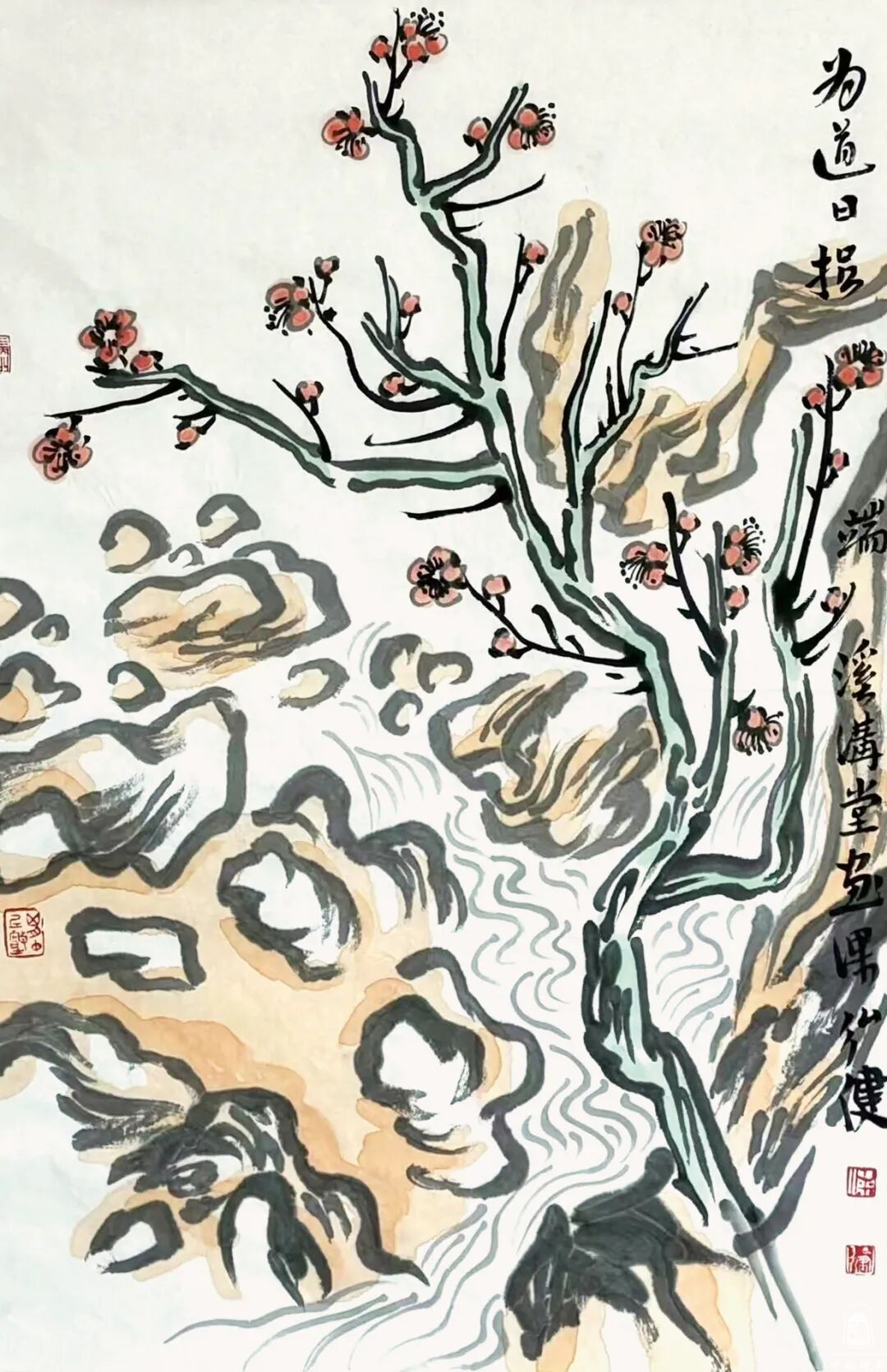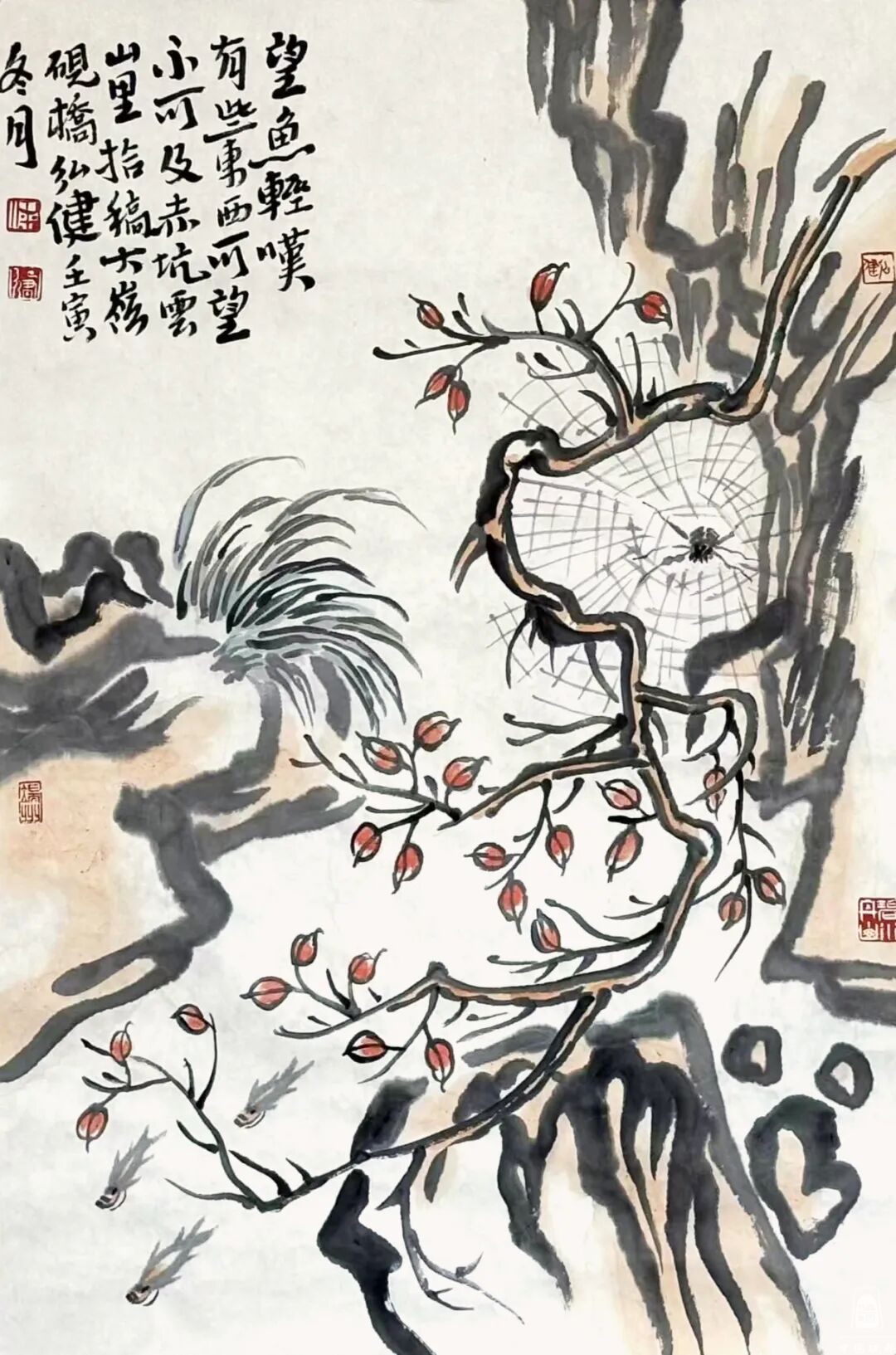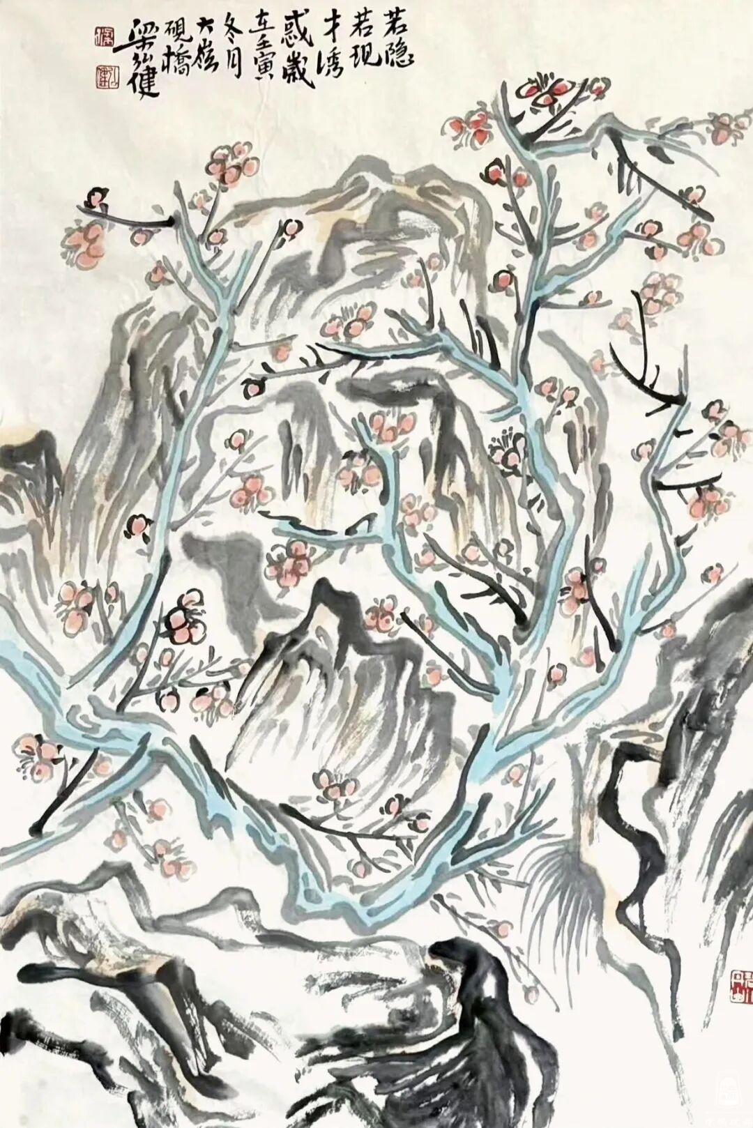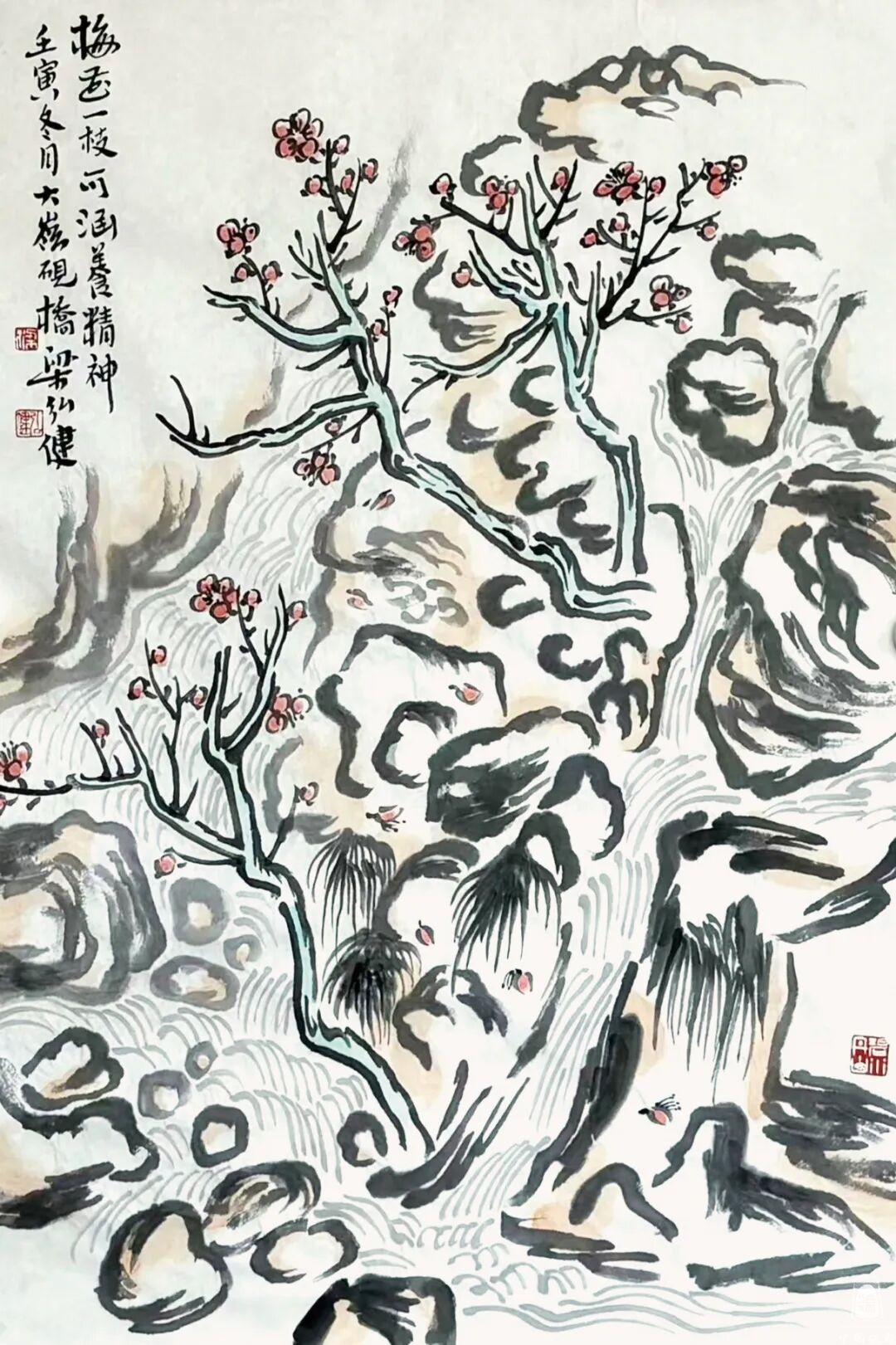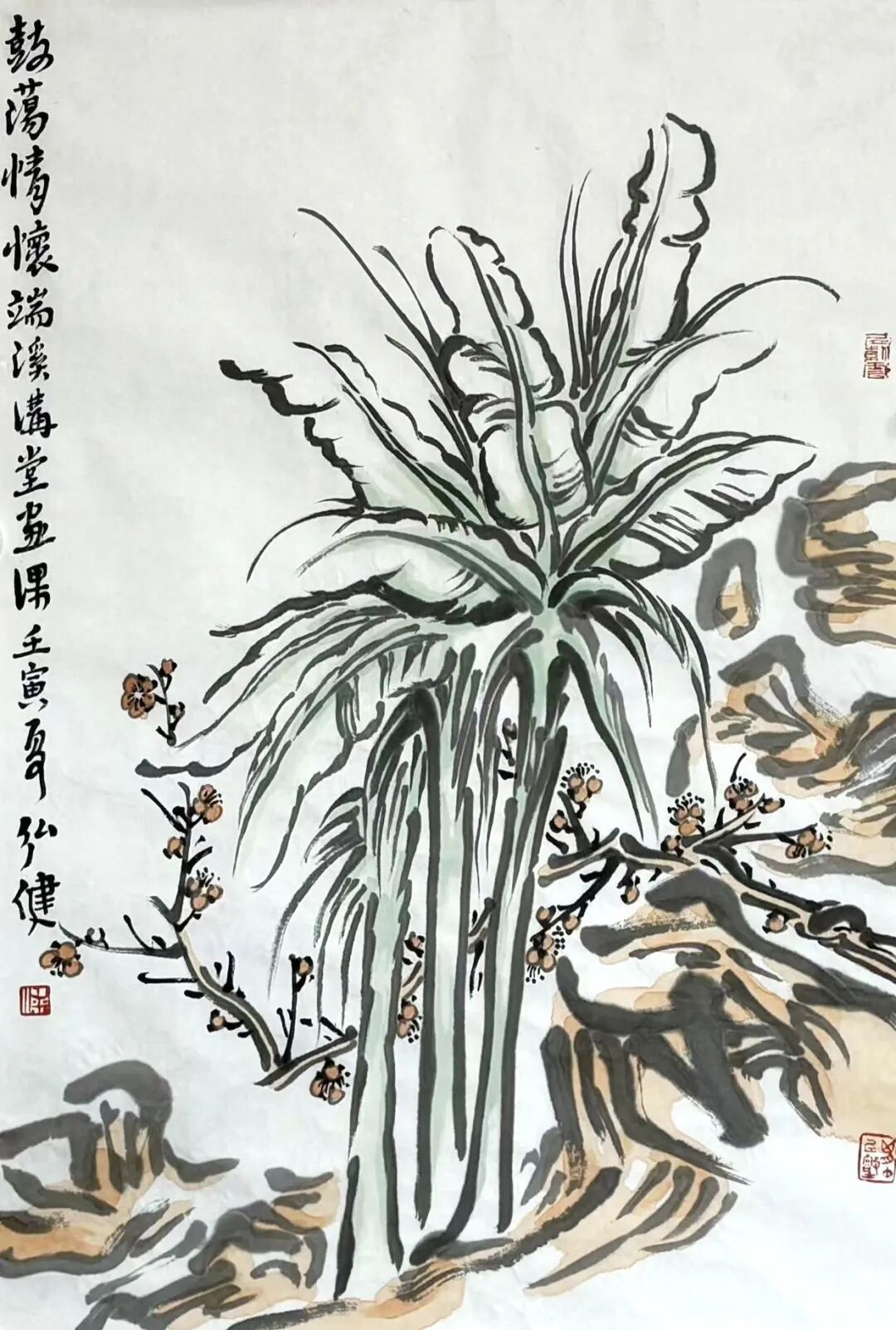 我在读梁弘健笔下的那些水墨花卉,体会到一种感觉:其画文质如玉,清雅几净,颇具浑朴精神。他的花卉作品,构图上往往带有一些景观衬底,穿越时空,或许融入了他个人的山水观和自然观,这种念想影响到花卉画的形态,花卉的容量增大了,非常醇厚的下笔,狠劲十足,笔笔生发。而且,那些花枝和花朵的疏密结构,将笔法生成出趣味来,这是一种个人特质,显示出大气格的调性,以粗放、稳健又不失空蒙、淡雅,朴拙之气。比如作品《为道日损》《若隐若现》《鼓荡情怀》《望鱼轻叹》,画面的品相不落俗套,其中赋色简约,笔法构图上错落有致。他写的跋文,补画之不足,有趣也有意。看《梅花一枝可涵养精神》,那纸上的梅树大于山,互为表里,突出梅香春日,朵朵映雪,寒日奇妙。
