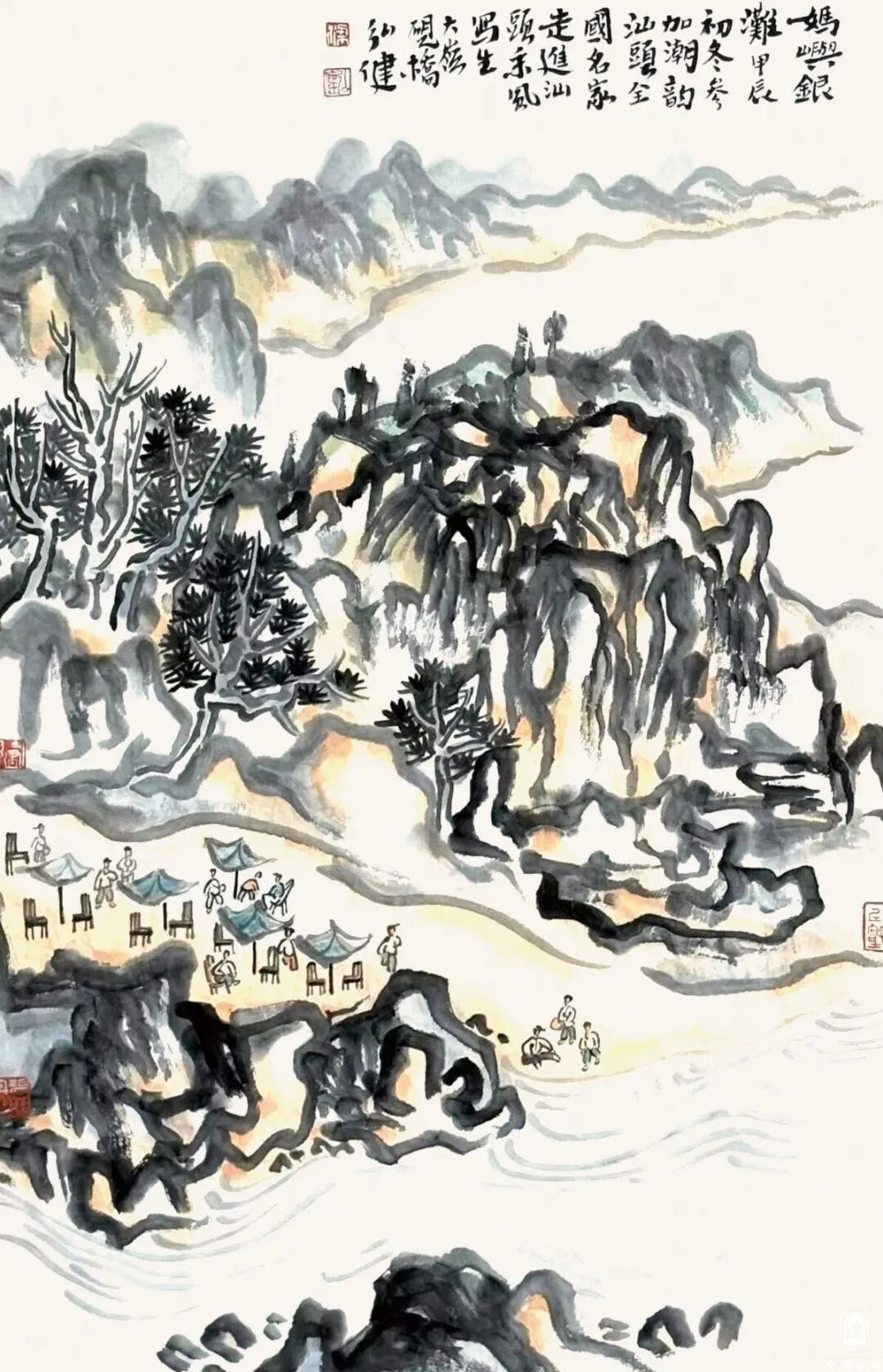 梁弘健的许多山水画里,以写生作品最为丰富,比如《云南東川行旅》《归牧图》《广宁游踪》《山前大雨》《妈屿岛银滩》《云山里写生系列》《凤凰百茶》《南澳宝川》《碧海殖蚝场》《江山行旅》等,这些写生都是星湖、北岭、鼎湖、西江之外的山川江湖,归于陌生,也可能造化出意外。其中《列云远近》颇有特色,以单纯的用笔,勾勒出山石树木,云水,远近各不同,疏密间沉着气质,悠悠然而独具纯粹感,而用笔的沉缓积力量在形质上,简而厚重,气格壮硕朴质,味浓郁。